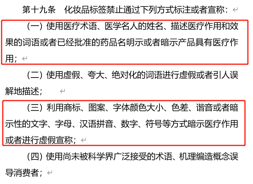除了“绷带”,企业宣称“护眼”“冷敷贴”“愈”等,都被驳回备案。均属于《化妆品标签管理办法》第十九条规定的,“明示或者暗示产品具有医疗作用”,属于化妆品标签禁止标注或者宣称的行为。